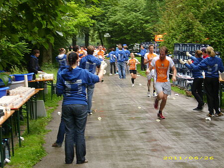 06:30 Uhr, Ettstraße, Regen, 18 Grad: Viele RK-Fahrzeue, wenige Polizeifahrzeuge. Geordnetes Gewimmel: Funkgeräte und Detailpläne zum zu besetzenden Standort werden ausgegeben. Lunchpakete und Getränke werden verteilt und auch die Nachfrage nach Gaben der Sponsoren wird erfüllt. Danach Abfahrt zu den Standorten: hier zum Aumeister im Englischen Garten, Laufkilometer 12 von 20,1.