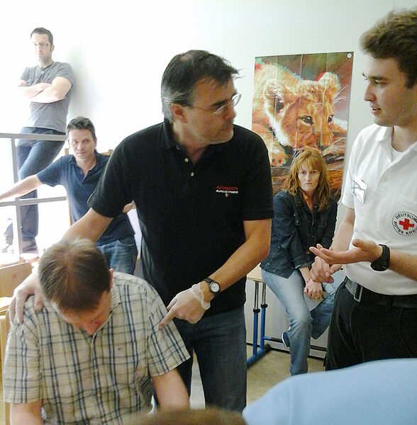 Zum Schluss gab es eine kleine Überraschung für die Teilnehmer: die Rotkreuzler ließen sie ein realistisches Fallbeispiel üben. Dazu hatten sie einen Verkehrsunfall zwischen einem Auto und einem Motorrad mit mehreren Verletzten simuliert.