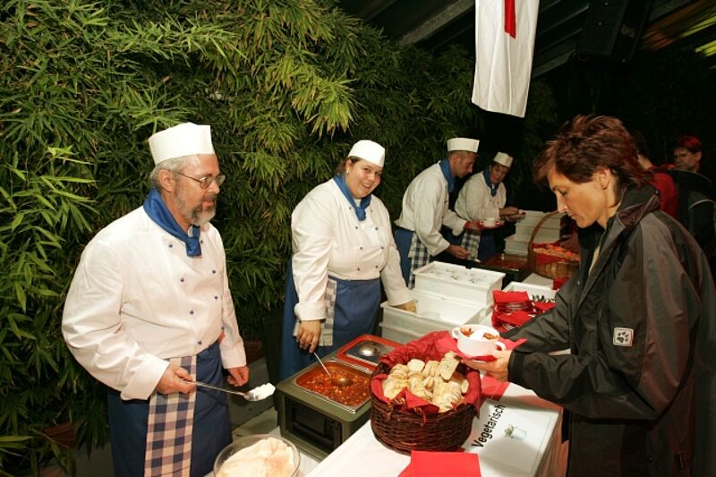 Betreuungsdienst des Münchner Roten Kreuzes mit Chili con carne und kalten Getränken. Ob an der Schänke, beim Spülen oder an der Essensausgabe: die ehrenamtlichen Helferinnen und Helfer gaben alles zum Wohl der Gäste.
