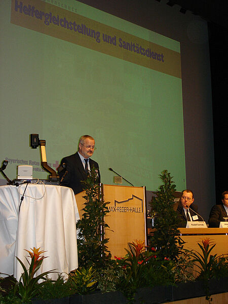 Wolf-Dietrich Schütz vom Referat Katastrophenschutz im Bayerischen Staatsministerium des Innern erläuterte die staatlichen Katastrophenschutzkonzepte und stand Rede und Antwort zur finanziellen Ausstattung. Das Plenum wies dabei mehrfach auf die Tatsache hin, dass die Leistungsfähigkeit des Katastrophenschutzes häufig nur durch den Einsatz selbst beschaffter Ausstattung der Hilfsorganisationen sowie das persönliche Engagement der ehrenamtlichen Helfer sichergestellt sei. Auf die Frage, warum Helfer der Hilfsorganisationen, die gemeinsam mit den Kollegen der Freiwilligen Feuerwehren regelmäßig bei größeren Unfällen oder Bränden zum Einsatz kommen, keinen Freistellungsanspruch gegenüber dem Arbeitgeber haben, wie er im Feuerwehrgesetz geregelt ist, antwortete Schütz: "Sie haben Recht. (...) Es besteht eine Ungleichbehandlung; derzeit können wir angesichts der Haushaltslage aber nichts ändern."
