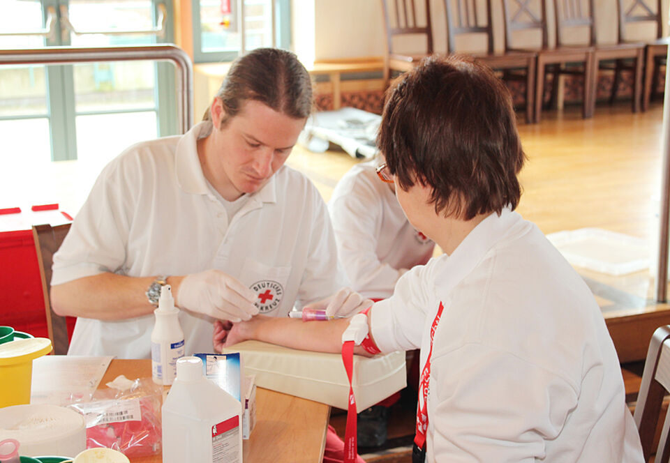 Etwa 50 ehrenamtliche Helferinnen und Helfer der Ortsvereine sorgten für kurze Wartezeiten und einen reibungslosen Ablauf. Sie berieten und informierten über den Ablauf der Stammzellenspende, dokumentierten die persönlichen Daten, entnahmen eine kleine Menge Blut und versorgten die Gäste mit Kaffee und Kuchen.