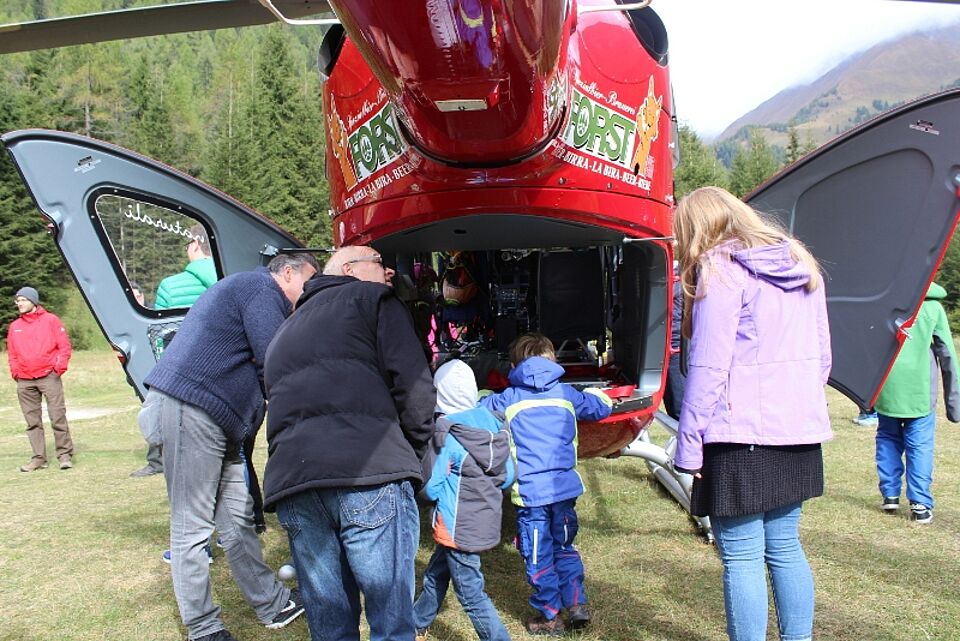 Als abschließenden Höhepunkt der Fahrt nach Südtirol durften die Aubinger Rotkreuzler am 9. Oktober noch bei einer Bergrettungs-Übung zuschauen und zwei Rettungshelikopter besichtigen. In Südtirol muss jeder Bergretter mindestens einmal im Jahr eine solche Übung absolvieren. Insgesamt war die Südtiroler Bergrettung mit ihren 702 Mitgliedern im vergangenen Jahr mehr als 1200 Mal im Einsatz – das sind über 10.000 Einsatzstunden. Auf großes Interesse stießen vor allem die Helikopter, die insbesondere von den Kindern der Aubinger Helfer genau inspiziert wurden.