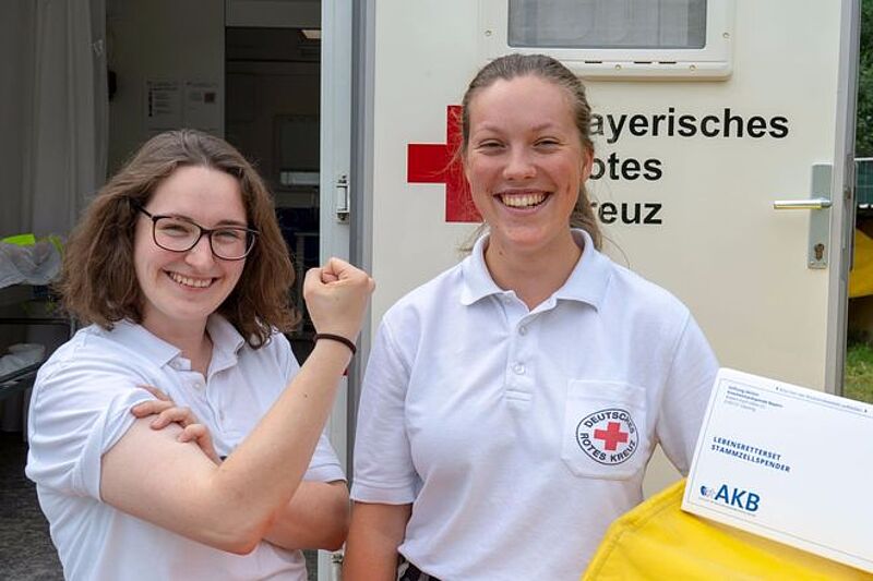 Tanja Würfl (18) macht gerade ihren Bundesfreiwilligendienst beim Münchner Roten Kreuz. Sie durchläuft dort verschiedene Stationen, eine ist das Tollwood. Sie hilft dort denen, die Hilfe suchen. „Für mich ist es ein super Einstieg in die Notfallmedizin. Ich kann hier meine Ausbildung zur Rettungssanitäterin machen und werde schon bald ein Bewerbungsgespräch haben, um die Ausbildung zur Notfallsanitäterin zu machen.“ Die verantwortliche Rettungssanitäterin auf dem Tollwood ist Nadine Kniffke (28). Seit ihrem 16. Geburtstag engagiert sie sich beim Roten Kreuz auf dem Tollwood. „Wir haben hier meistens kleine Verletzungen und Wunden zu versorgen. Für mich ist der Dienst eine Herzenssache.“ Beide unterstützen die Kooperation zwischen Stiftung AKB und Rotem Kreuz gern: „Jede*r zwischen 17 und 45 Jahren kann sich bei uns ein Lebensretterset gratis mitnehmen und daheim oder mit Hilfe des Hausarztes über eine kleine Blutabnahme bzw. Speichelprobe Stammzellspender werden. Wir haben die Sets hier vor Ort.“
