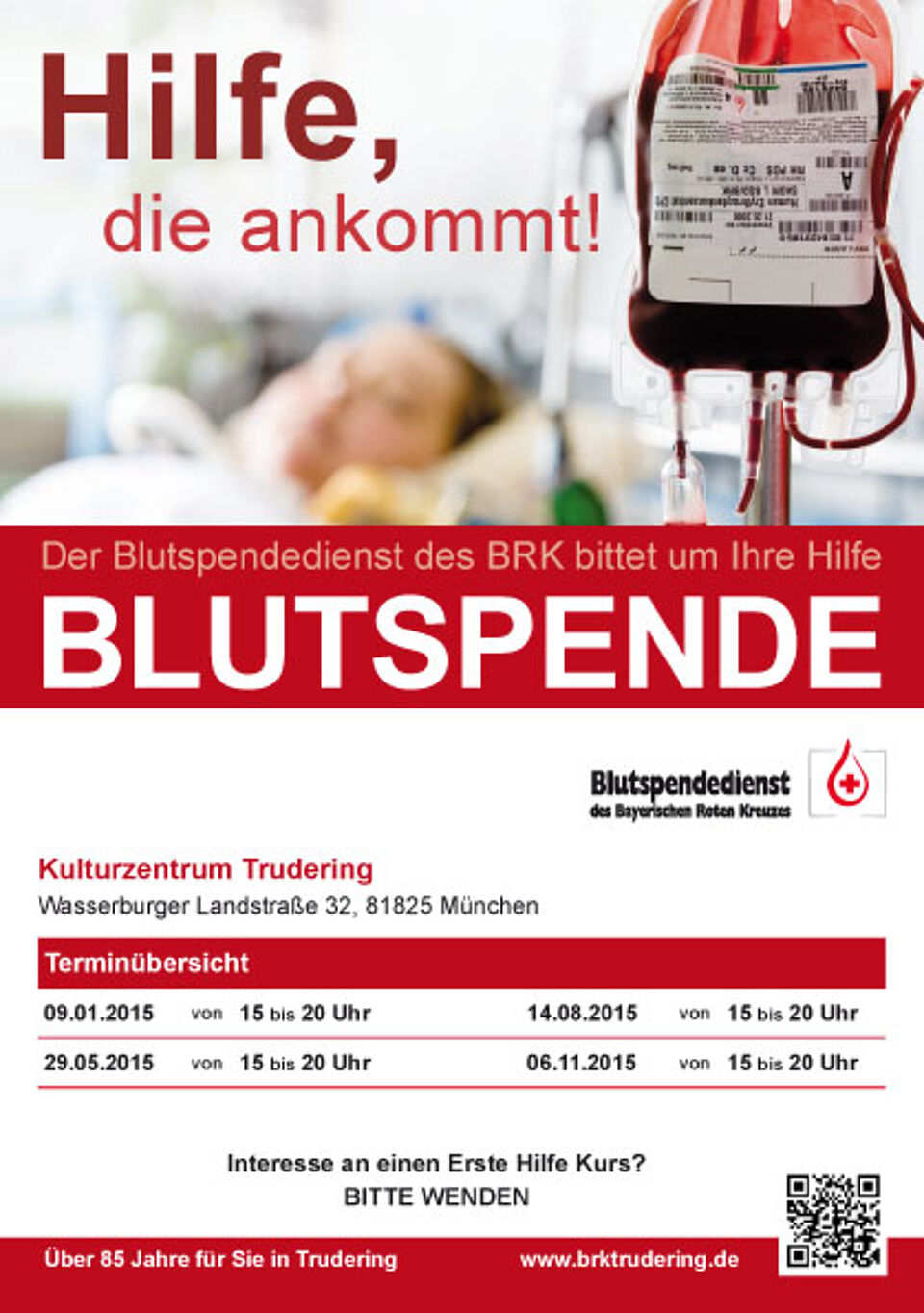 Der nächste Blutspendetermin in Trudering ist am Freitag, den 6. November im Kulturzentrum, Wasserburger Landstraße 32, in der Zeit von 15 bis 20 Uhr.