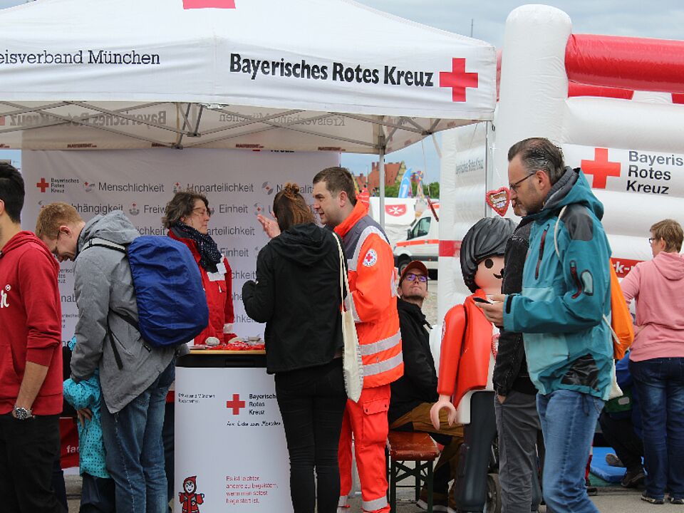 "Ich freue mich sehr, dass so viele Münchner Bürger trotz des schlechten Wetters gekommen sind, um sich über die Angebote des Münchner Roten Kreuzes zu informieren", so Michael Greiner, zuständig für den Infostand.