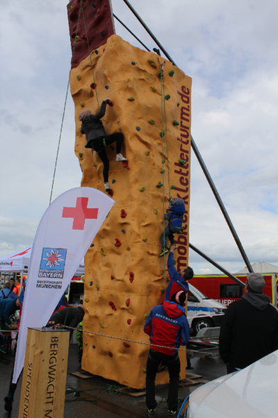 Das Rote Kreuz stellte sich mit all seinen 5 Gemeinschaften vor. Neben den vielen Fahrzeugen von der Wasserwacht, Bergwacht, dem Fachdienst Technik und Sicherheit und dem Rettungsdienst ausgestellt wurden, konnte man sich auch selbst betätigen. Sei es beim Reanimationstraining, oder am Kletterturm der Bergwacht. Am Stand der Wasserwacht war das Wissen über die Baderegeln gefragt.