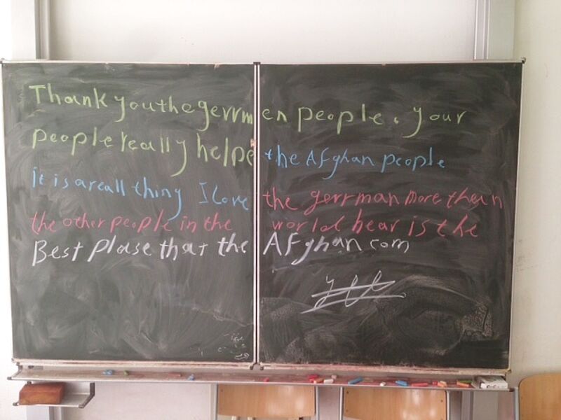 Schönes Symbol: Flüchtlinge aus Afghanistan haben ihren ehrenamtlichen Helfern vor der Weiterreise ein Dankeschön auf der Tafel hinterlassen. Wir sagen: gern geschehen! Fotos: M. Vogel, D. Hoos