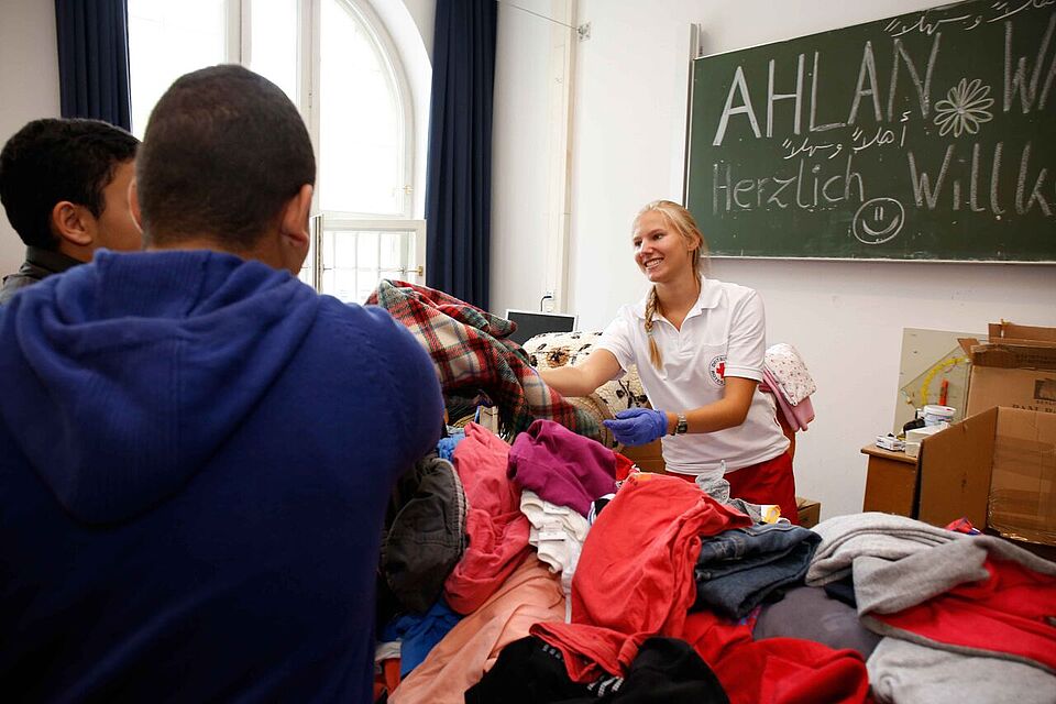 Herzlich Willkommen: Eine ehrenamtliche Helferin des Münchner Roten Kreuzes gibt gespendete Kleidung an Flüchtlinge aus