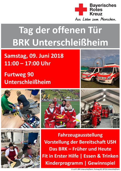 Wir freuen uns auf Ihren Besuch beim Tag der offenen Tür der Bereitschaft Unterschleißheim des Münchner Roten Kreuzes! Am Samstag, den 9. Juni 2018 ist von 11 bis 17 Uhr im Rotkreuzhaus Furtweg 90 einiges geboten.