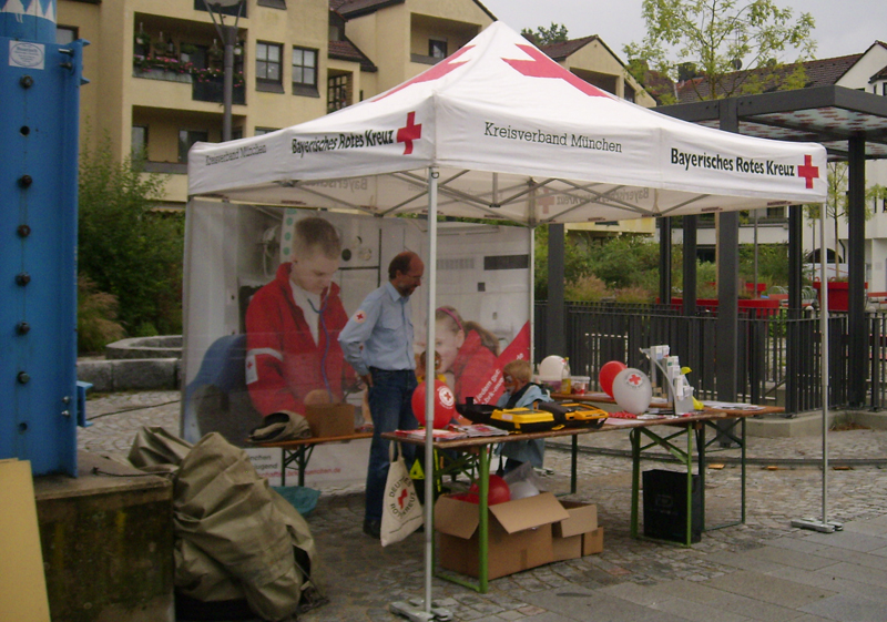Von der Planegger Bürgermeisterin Annemarie Detsch wurde der Marktplatz für den Kindertag freigegeben und nach den Planungen und Vorbereitungen von Jugendwart Markus Englmeier, Bereitschaftsarzt Dr. Wöhrle und Mira Schuirer bauten die 20 Mitglieder der Bereitschaft einen eigenen bunten Marktplatz auf.