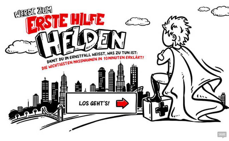 In vier kurzen spielerischen und leicht verständlichen Filmgeschichten lernen die Nutzer das „H.E.L.D“-Modell kennen. Die Buchstaben stehen für „Hilfe rufen“, „Ermutigen und trösten“, „lebenswichtige Funktionen kontrollieren“ und „Decke unterlegen“. Um am Ende selbst ein Held zu werden, muss der Nutzer nach jedem Video Quizfragen beantworten. Der interaktive Film ist auf Deutsch, Englisch und Spanisch abspielbar – und lässt sich in sozialen Medien teilen oder auf Webseiten einbetten.