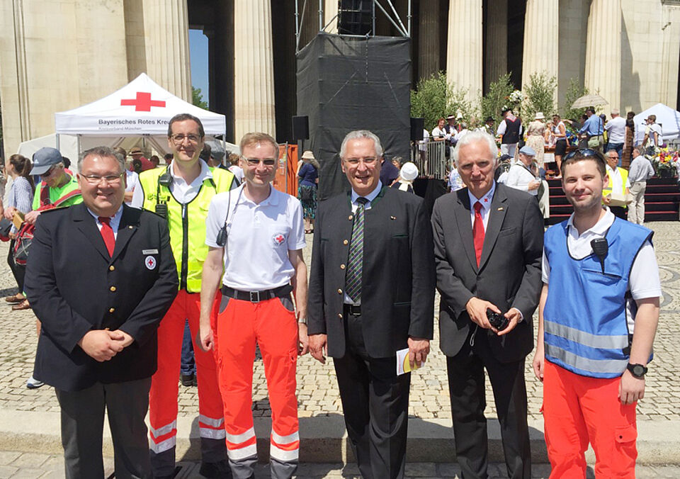 Auf dem Königsplatz gab es dann prominente Anerkennung für die Rotkreuzhelfer*innen: Innenminister Joachim Herrmann und Karl-Heinz Demenat, Vorsitzender des Münchner Roten Kreuzes, bedankten sich für den Einsatz am Feiertag.