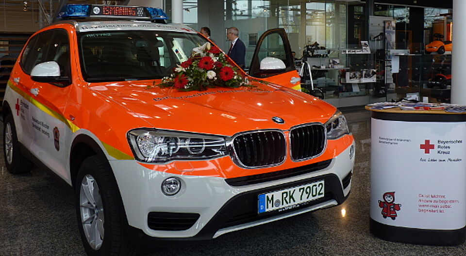 Die Mitglieder der Bereitschaft Ismaning des Münchner Roten Kreuzes freuen sich über das neue Einsatzfahrzeug für den Helfer vor Ort, einen BMW X3. Bürgermeister Dr. Alexander Greulich übergab am Samstag die Schlüssel an Fried Saacke, Leiter der Bereitschaft Ismaning.