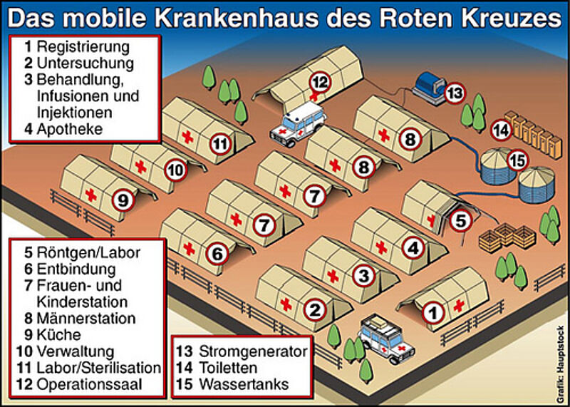 Das große Rotkreuz-Hospital hat 120 stationäre Betten und kann zusätzlich bis zu 700 Patienten versorgen. „Damit ist die medizinische Versorgung für ein Einzugsgebiet von 30.000 Menschen sicher gestellt", erklärt die BRK-Präsidentin und ergänzt, dass für den Betrieb des Rotkreuz-Hospitals 100 Ärzte, Schwestern, Pfleger und Techniker benötigt werden. Derzeit wird das medizinische und technische Team für das Hospital zusammengestellt. BRK-Präsidentin: „Voraussetzung für einen solchen Einsatz ist der „Basic Training Course“ vom Deutschen Roten Kreuz. Dieser garantiert, dass alle speziell ausgebildeten Auslands-Katastrophenhelfer weltweit nach einheitlichen Standards arbeiten. Damit können die Einsatzkräfte jederzeit, egal zu welcher nationalen Rotkreuz-Gesellschaft sie gehören, reibungslos miteinander arbeiten.“