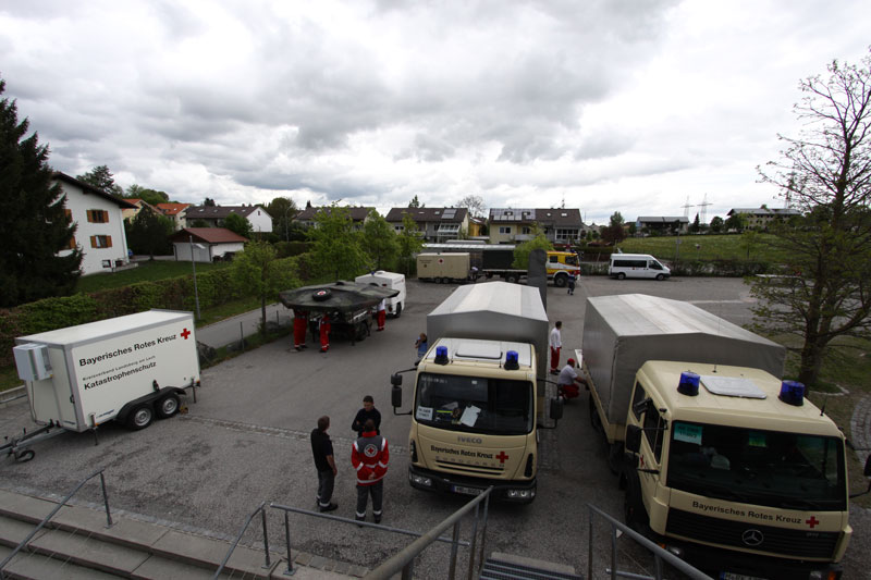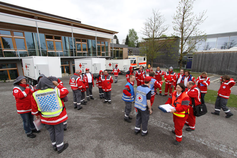 Im Rahmen des Betreuungsdienst- Kontingentes Oberbayern haben vom Samstag bis Sonntag rund 80 ehrenamtliche Helfer des Roten Kreuzes (25 davon aus München) den Ernstfall geprobt: Infolge starken Regens und Tauwetter in den alpinen Hochlagen ist es im Landkreis Garmisch-Partenkirchen zu einer allgemeinen Hochwasserlage gekommen, so die Annahme der Übung. Insbesondere im Loisachtal habe sich die Hochwasserlage im Ortsbereich Eschenlohe und Teilen von Oberau dramatisch zugespitzt, sodass ca. 500 Personen evakuiert werden mussten. Da die örtlichen Einsatzkräfte bereits in Einsätzen gebunden bzw. auf Grund der Hochwassersituation nur bedingt zur Verfügung stehen, musste Hilfe aus dem restlichen Oberbayern angefordert werden. Diese haben zwei Anlaufstellen zur Kanalisierung der Evakuierten gebildet und im Staffelsee- Gymnasium Murnau eine Unterkuft für die Evakuierten eingerichtet und die Nacht hindurch bis Sonntagvormittag betrieben. Neben Schlafmöglichkeiten wurde auch die Verpflegung und psychosoziale Betreuung der Betroffenen geübt.