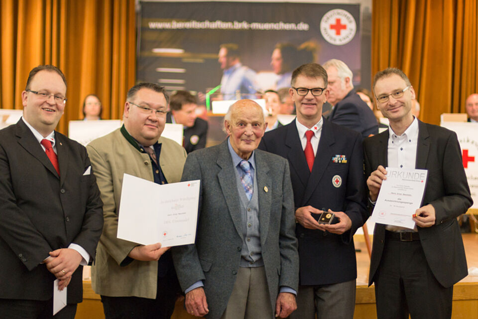 Anschließend überreichte Jürgen Terstappen die Zeit- und Leistungsauszeichnungen an die Leitungskräfte und Jubilare. Höhepunkt war die Übergabe der Urkunde für 75 Dienstjahre an Ernst Neumeier, Mitglied der Altherrenkameradschaft und Seniorinnen. Der ganze Saal erhob sich zu Ehren des verdienten Rotkreuzkollegen und klatschte lange Applaus. Der 93jährige war 1939 ins Rote Kreuz eingetreten und hatte sich seither in verschiedenen Aufgabenbereichen engagiert.