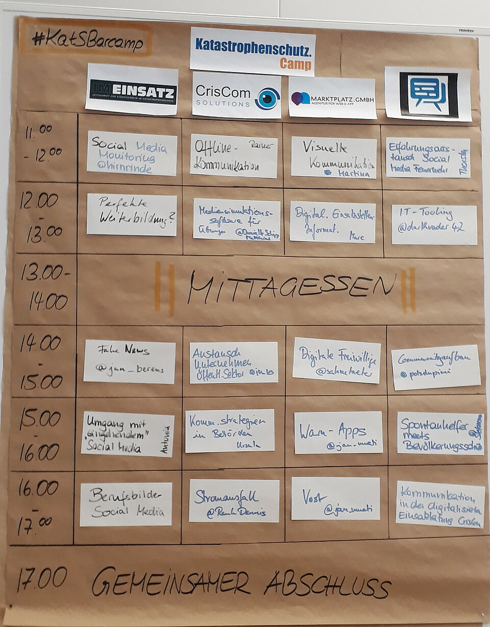 Wie sich das für ein Barcamp gehört, kamen die Themen von den Teilnehmer*innen selbst: Vom Monitoring von social media-Kanälen über das Informationspotenzial sozialer Netzwerke bei Katastrophenlagen, dem Potenzial digitaler Freiwilliger und ungebundener Helfer*innen bis hin zu den Aufgaben von "virtual operation support teams" (VOST), Berufsbildern, sinnvollen Weiterbildungskonzepten oder der offline-Kommunikation bei Stromausfall war ein breites Themenspektrum vertreten.