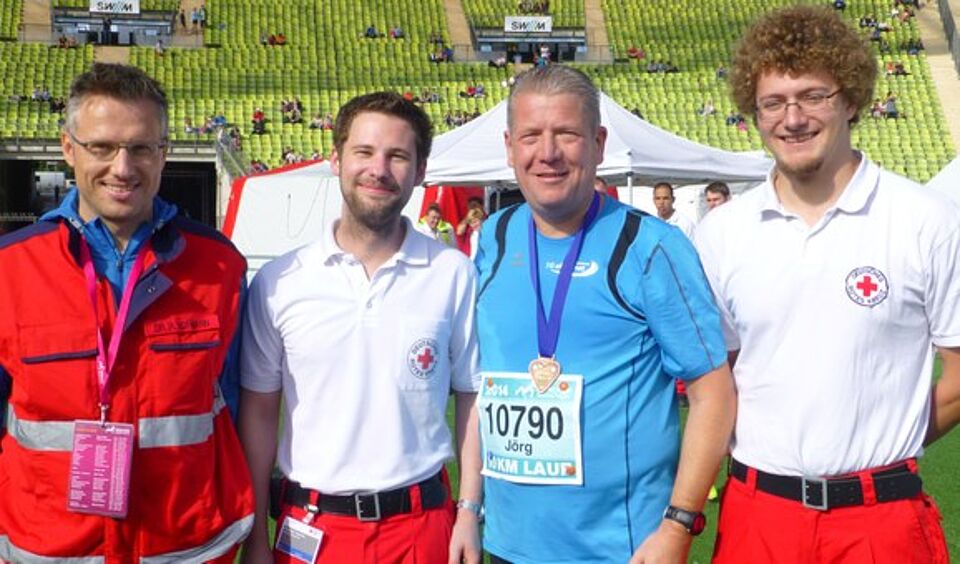 Am Sonntag absolvierten rund 170 ehrenamtliche Helfer und sechs Ärzte des Münchner Roten Kreuzes nur eine Woche nach dem Oktoberfest den größten Tageseinsatz des Jahres. Mit mehr als 20 Sanitätsstationen entlang der Laufstrecke und im Olympiastadion und einer zentralen Unfallhilfsstelle im Zieleinlauf standen sie für rund 21.000 Teilnehmer des München Marathon zum Einsatz bereit. Mit dabei war auch ein besonderer Läufer: Jörg Eisenauer. Schon 2013 hatte er an dem Marathon teilgenommen. Direkt neben dem Sanitätszelt war er damals zusammengebrochen. Die Helfer vom Münchner Roten Kreuz waren sofort zur Stelle und leiteten unverzüglich die Wiederbelebung ein. Heuer lief er die 10-Kilometer-Strecke und hat sich bei dieser Gelegeneheit bei zwei der beteiligten Helfer bedankt.