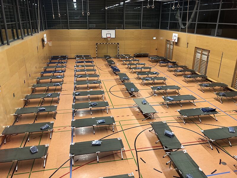 So wurden hunderte Feldbetten aufgestellt, Ausgabestationen für Lebensmittel aufgebaut, Räumlichkeiten für medizinische Versorgung und Covid-19-Testungen ertüchtigt. Die Kapazität der Notschlafstelle umfasst ca. 300 Plätze.