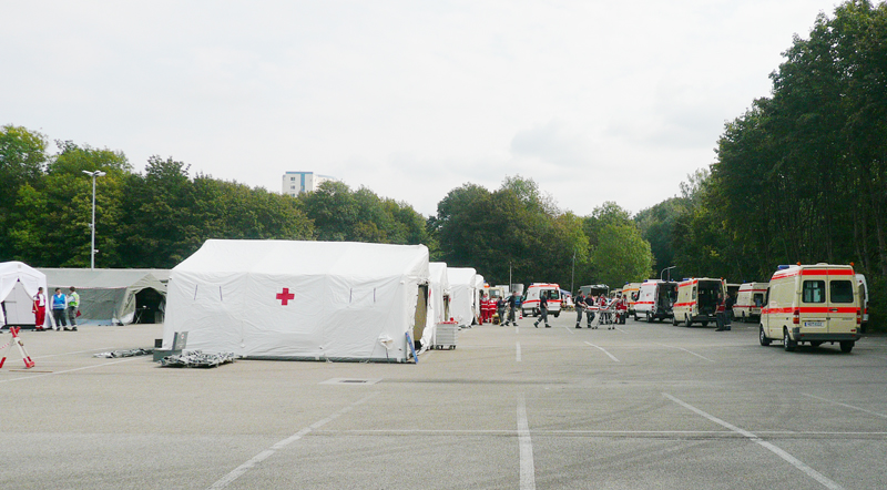 Die ehrenamtlichen Helfer unserer Schnelleinsatzgruppe waren etwas überrascht, als sie gestern gegen 8:30 Uhr von ihren Piepsern geweckt wurden. Denn statt auf einen echten Einsatz ging es für sie nach Neuburg zu einer groß angelegten Übung des Roten Kreuzes in Oberbayern. Das Ziel: herauszufinden, wie lange es dauert, Helfer überregional zu alarmieren, zusammenzuführen und sie einen Behandlungsplatz aufbauen zu lassen.