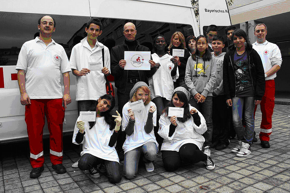 Günther Fuggis, Jugendsozialarbeiter des Kinderschutz e.V. und ehrenamtlich als Rettungssanitäter und Ausbilder beim Bayerischen Roten Kreuz tätig, freut sich über das Engagement der sechs frisch gebackenen Ersthelfer. Er hofft, dass sie sich auch über die Schulzeit hinaus noch für den Jugendsanitätsdienst begeistern lassen. Natürlich weiß er auch, dass die Jugendlichen sich nicht alle nur aus selbstlosem Engagement für den Dienst gemeldet haben. „Die Schülerinnen und Schüler bekommen hier eine kostenlose Ersthelferausbildung, die ihnen unter anderem auch bei der späteren Führerscheinprüfung nützlich wird. Der freiwillige Dienst als Schulsanitäter ist außerdem auch eine Empfehlung bei der Bewerbung für medizinische Berufe. Und Arzthelferin, Altenpfleger oder Krankenschwester können schließlich auch Hauptschüler werden.“