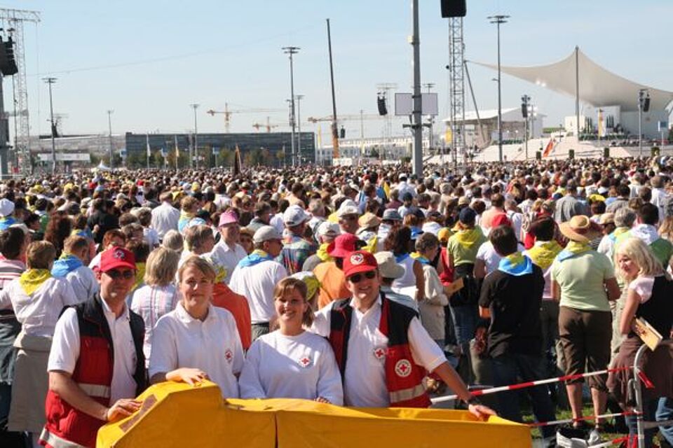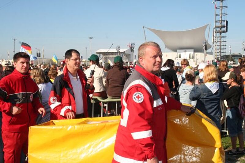 Die lange Wartezeit für die Pilger und die Sonne wirken beim Gottesdienst wie befürchtet. Die Helfer des Roten Kreuzes, in Teams mit Rolltragen unterwegs auf Streife im Gelände sind fast durchgehend beschäftigt, Kreislaufprobleme zu behandeln und die Betroffenen in die Zelte der Unfallhilfsstelle zu bringen, wo sie sich ausruhen können oder von einem Arzt weiterbehandelt werden können. Auch eine 20-jährige Frau ist unter denen, die während des Papstgottesdienstes zu Arzt Dr. Binner gebracht werden. Eine Beihnahegeburt. "Die junge Frau hatte wohl gehofft, während der Papstmesse entbinden zu können", so Dr. Binner. "Nach Aufklärung über die Risiken hat sie sich aber bereiterklärt, in eine Klinik gebracht zu werden".