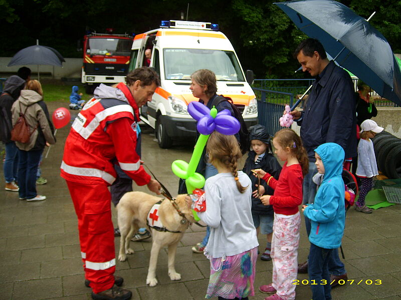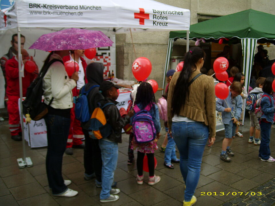 Das Rote Kreuz übernahm den Sanitätsdienst bei dieser Veranstaltung. Fünf Helfer der Jubiläums-Bereitschaft Trudering (85 Jahre) und Z1 stellten Einsatz- und Rettungsfahrzeug vor. Viele Interessierte wollten mit den "Innereien" und deren Funktion vertraut gemacht werden. Parallel dazu wurde ein Infostand betrieben. Nicht nur Fragen rund um das RK wurden gestellt und beantwortet, sondern auch den vielen Bitten der Kinder um die roten DRK- und weißen BRK - Luftballons entsprochen.