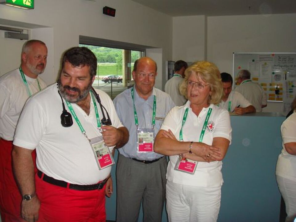Es konnten gute Nachrichten überbracht werden. Der größte bundesdeutsche Einsatz seit dem zweiten Weltkrieg verläuft aus Sicht des Bayerischen Roten Kreuzes sehr ruhig. Trotz großer anhaltender Hitze und Massenanstürme beim Fan-Fest im Olympiapark hatte es keine ernsthaften Probleme gegeben. "Kreislaufprobleme und Sonnenstiche waren Hauptursache der Einsätze", so Landesarzt Professor Peter Sefrin.