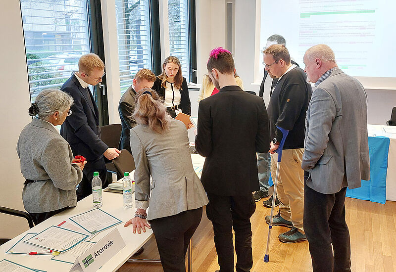Nach dem gemeinsamen Mittagessen wechselten die Teilnehmer*innen dann in förmliche Kleidung und lasen sich in ihre Rollen als Staatenvertreter*innen der Konferenz ein. In der eigentlichen Simulation verhandelten sie dann auf Basis ihrer Länderinteressen den vorgelegten Konventionsentwurf. Dafür suchten sie Verbündete, hielten Reden, argumentierten für alternative Formulierungen und stimmten über die verschiedenen Vorschläge ab. Im Ergebnis konnten sich die fiktiven Staaten nach zähen Verhandlungen knapp auf eine fünfte Genfer Konvention einigen.
