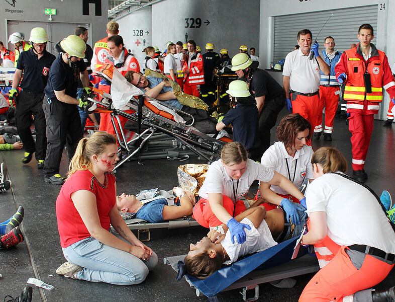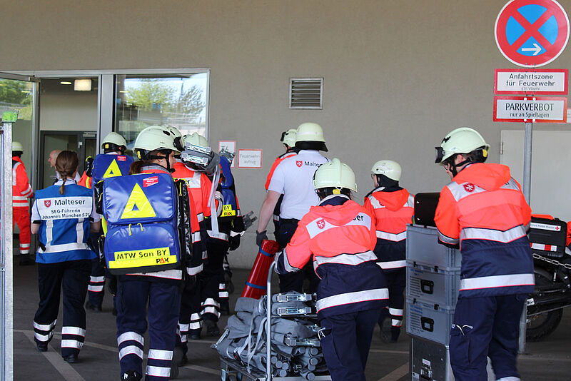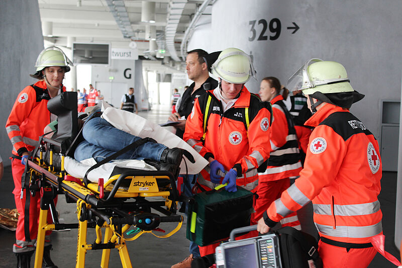 Mit an der Rotkreuz-Übung beteiligt waren der Arbeiter-Samariter-Bund, die Johanniter Unfall-Hilfe, der Malteser Hilfsdienst, die Freiwillige Feuerwehr München, das Technische Hilfswerk (THW) sowie die beiden Firmen MKT Krankentransport und Aicher Ambulanz. "Ziel der Übung war es, die Zusammenarbeit des Sanitätsdienstes der Veranstaltung, der Rettungsdienste sowie weiterer Kräfte zu üben, die bei so einem Notfall alarmiert werden", sagt Alexander Grochowski vom Münchner Roten Kreuz, der die Übung leitete und mit seinem Team insgesamt 800 Stunden ehrenamtlich in die Vorbereitung investiert hat.