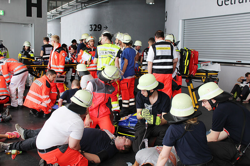 Nach der simulierten Explosion verschaffen sich die Helfer des Sanitätsdienstes zunächst einen Überblick, wer wie schwer verletzt ist. Sie retten die Verletzten aus dem oberen Rang der Allianz-Arena und bilden vor dem Fanblock eine Patientenablage. Dort beginnen die Sanitäter und Ärzte, die Verletzten zu versorgen und zu betreuen. Zugleich wird die Leitstelle informiert. Diese alarmiert weitere Kräfte in die Allianz-Arena.
