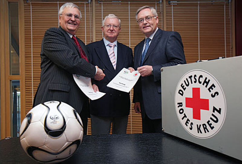 Horst R. Schmidt, 1. Vizepräsident und Dr. Theo Zwanziger, Vizepräsident des OK FIFA WM 2006 sowie DRK-Präsident Dr. Rudolf Seiters unterzeichneten am Mittwoch in Frankfurt am Main den Vertrag, durch den dem DRK die Verantwortung zur umfassenden medizinischen Versorgung der Zuschauer in den Stadien übertragen wird.