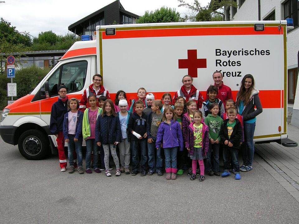 In Baierbrunn erwarteten die 20 Kinder uns und den Rettungswagen sehnsüchtig. Zu Beginn erklärte Bereitschaftsleiterin Jasmin Kohlenz einige theoretische Grundlagen der Ersten Hilfe. Danach teilten wir die Kids in drei Gruppen auf, um an verschiedenen Stationen den Kindern unseren Rettungswagen, die Stabile Seitenlage und Wundversorgung zu erklären.