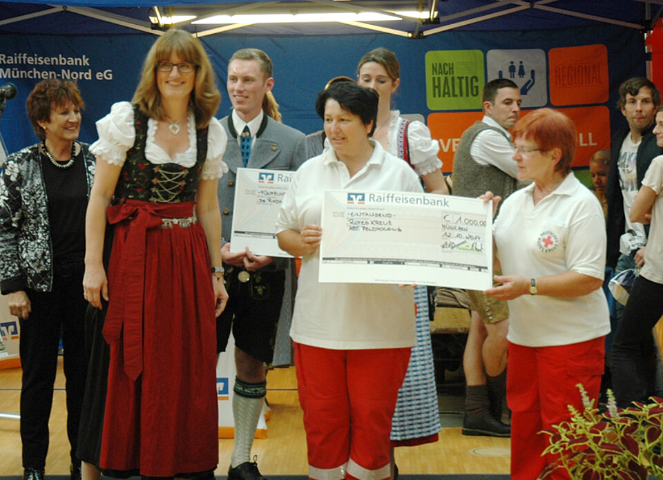 Der Scheck wurde im Rahmen der veranstalteten Gewerbeschau des Vereins am 11. und 12.10.2014 in der Feldmochinger Mehrzweckhalle Fagana von der Kassiererin des Vereins, Frau Riepl, in Anwesenheit des Vereinsvorsitzenden Herrn Kreiter überreicht. Da die Bereitschaftsleitung durch einen anderen Rot-Kreuz-Einsatz gebunden war, freuten sich die langjährigen Mitglieder Sylvia Mayer und Angela Lobinger, den Scheck in Höhe 1.000 Euro in Empfang nehmen zu können.