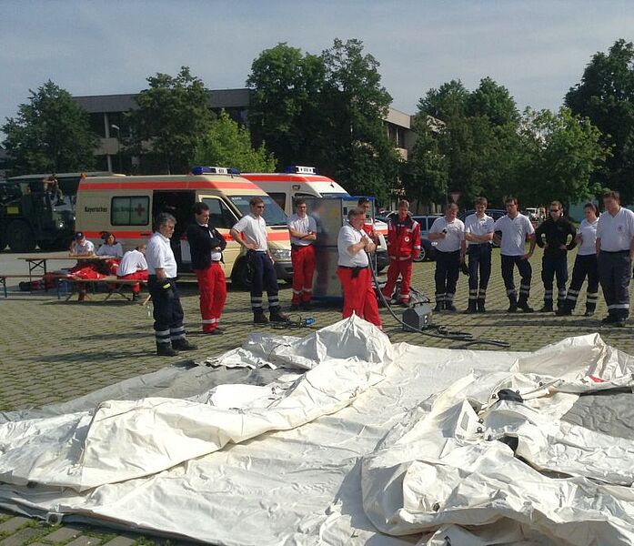 In Osterhofen sind seit Donnerstag eine Schnelleinsatzgruppe Information/Kommunikation und eine Gruppe Technik und Sicherheit zur Unterstützung eines Betreuungskontingentes im Einsatz. Die Kommunikationsexperten haben ihren Einsatz gestern Abend beendet, die Techniker sind noch vor Ort. Sie nutzen die einsatzfreie Zeit für die Fortbildung aller eingesetzten Helfer in Themen wie Zeltaufbau und Unfallverhütung.