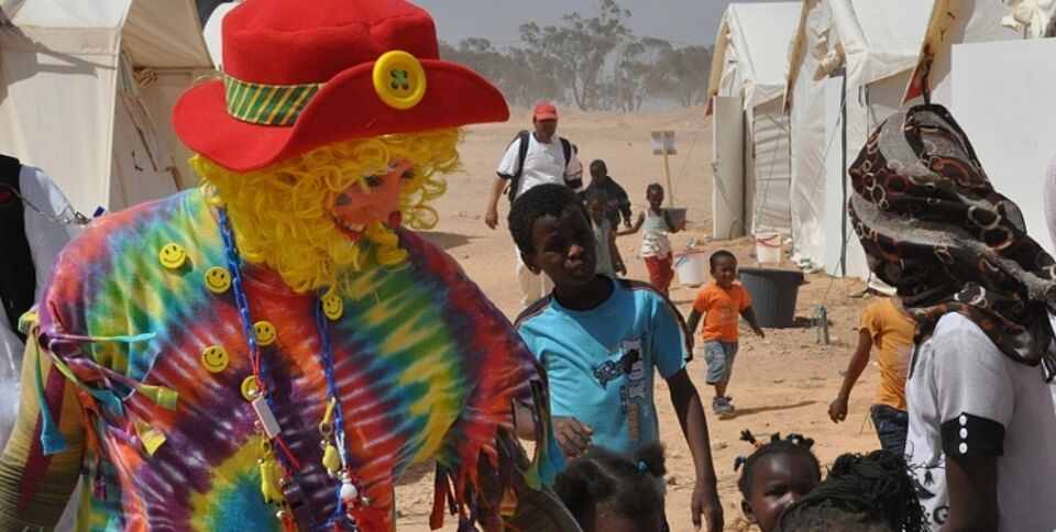 Was bringt Hunderte Erwachsene und Kinder in einem Durchgangslager für Flüchtlinge in der Nähe der tunesisch-libyschen Grenze in Mitten eines Sandsturms zum Jubeln? Der Clown Mimi.