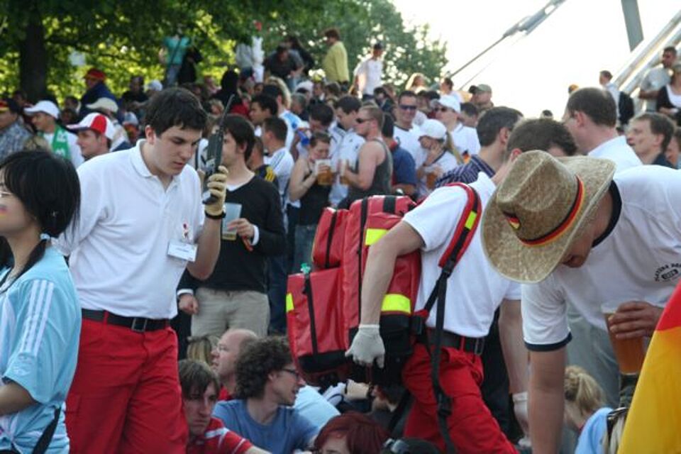 Das schöne Wetter zieht wesentlich mehr Zuschauer in die Public-Viewing Bereiche als zunächst erwartet. Das heiße Wetter und die starke Sonneneinstrahlung sorgt zusätzlich für ein erhöhtes Einsatzaufkommen. Dies mussten auch die 15 Rotkreuz Helfer und Ärzte im Fan-Park im Olympiagelände beobachten.
