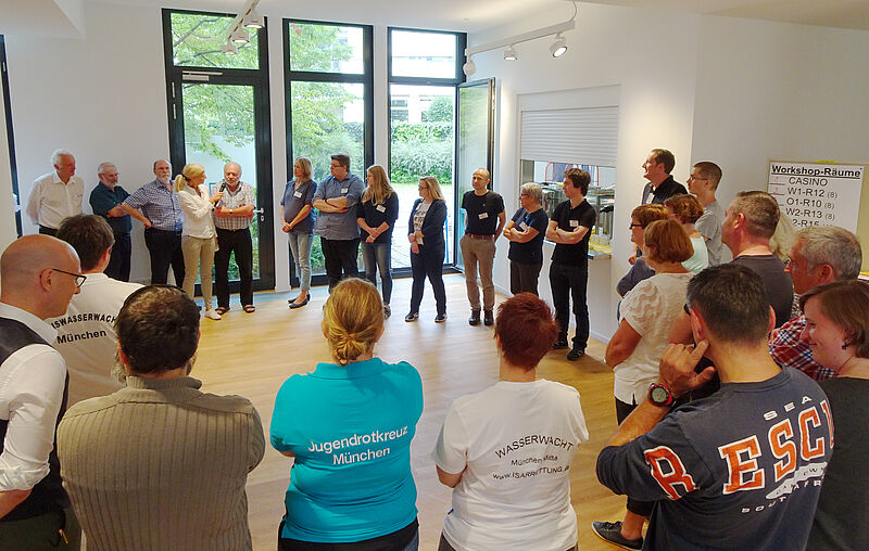 Am 21. Juli fand in den Räumen der Kreisgeschäftsstelle ein Zukunftsworkshop der ehrenamtlichen Leitungskräfte aller fünf Rotkreuzgemeinschaften statt. Rund 50 Vereinsmanager*innen aus Bereitschaften, Bergwacht, Jugendrotkreuz, Wasserwacht und Wohlfahrts- und Sozialarbeit machten sich in einem intensiven Tag Gedanken über die Zukunft der ehrenamtlichen Rotkreuzarbeit in Stadt und Landkreis München. Eingeladen hatte der Vorstand des Münchner Roten Kreuzes, weshalb neben dem Vorsitzenden Karl-Heinz Demenat und seiner Stellvertreterin Sabine Wagmüller auch etliche weitere Vorstandsmitglieder teilnahmen.