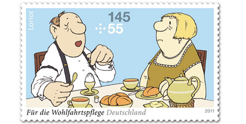 Vier bekannte Loriot-Motive zieren die Wohlfahrtsmarken 2011, die am 10. Januar im Schloss Bellevue der Öffentlichkeit vorgestellt wurden. Bundesfinanzminister Wolfgang Schäuble übergab Erstdrucke der Marken an Bundespräsident Christian Wulff in Anwesenheit von Donata Freifrau Schenck zu Schweinsberg, Präsidentin der Bundesarbeitsgemeinschaft der Freien Wohlfahrtspflege e. V. und Vizepräsidentin des Deutschen Roten Kreuzes.