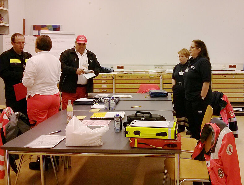 Am Messegelände sorgt eine Schnelleinsatzgruppe Behandlung des Münchner Roten Kreuzes für einen kurzen Gesundheits-Check der ankommenden Flüchtlinge, eine Schnelleinsatzgruppe Betreuung des Roten Kreuzes aus Weilheim betreut die Flüchtlinge. Im Luisengymnasium haben die Schnelleinsatzgruppen Betreuung des Münchner Roten Kreuzes und der Malteser heute früh die Nachtschicht des Arbeiter-Samariter-Bundes abgelöst.